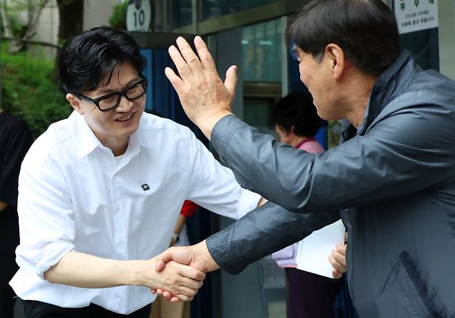 | ▲ 한동훈 전 국민의힘 대표가 14일 오후 부산 북구 만덕2동 행정복지센터를 찾아 전입신고를 마친 뒤 주민과 인사하고 있다. |