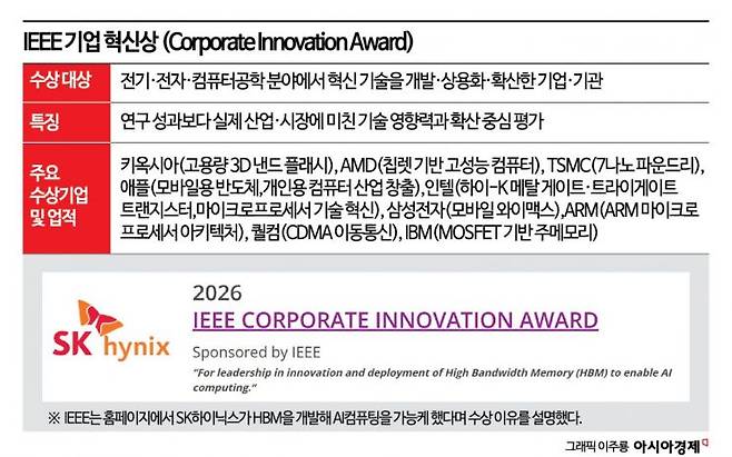 IEEE는 SK하이닉스가 AI 연산을 가능하게 한 고대역폭 메모리(HBM) 기술 개발과 확산을 이끈 점을 수상 이유로 밝혔다.