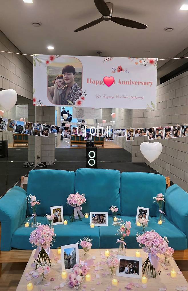 특히 시선을 끄는 건 소파 뒤편 문구다. 'Happy Anniversary'라고 적힌 대형 현수막과 함께 한 커플의 사진이 걸려 있고 그 아래에는 두 사람의 추억이 담긴 사진들이 줄지어 장식돼 있다. 하트 풍선과 함께 꾸며진 공간 전체가 마치 이벤트 현장을 연상케 한다. 특히 사진 중앙에 직접 추가한 것으로 보이는 '내 아내'라는 문구가 눈길을 끈다.