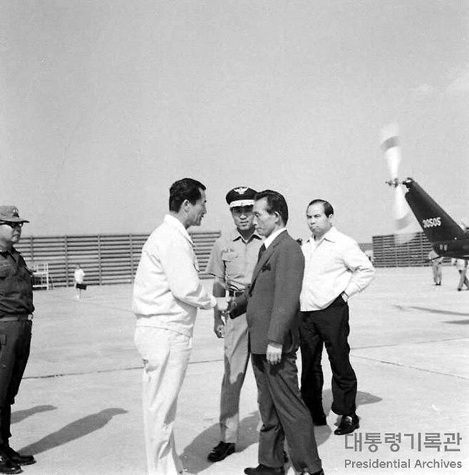 | ▲ 차지철 경호실장이 1974년 박정희 대통령의 전남 수해지구 시찰을 수행하고 있다. |
