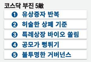 증권가에서는 코스닥시장이 장기 부진에 빠진 원인으로 △유상증자·전환사채(CB) 발행 등 주주가치 희석 △허술한 상장폐지 기준 △기술특례상장 바이오주 쏠림 △공모가격 부풀리기 △불투명한 기업 지배구조 등 '5적(敵)'을 꼽고 있다. 그간 코스닥시장 질서를 어지럽힌 '잡초' 솎아내기에 소홀했던 규제당국과 한국거래소의 매너리즘은 '5적'이 활개 칠 토양을 조성해왔다는 평가다.