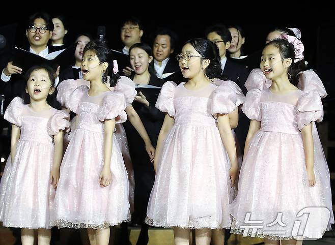 (경산=뉴스1) 공정식 기자 = 24일 오후 경북 경산시 중방동 남매지 야외공연장에서 열린 '경산시립합창단과 함께하는 음악회-봄빛 속에 피어나는 우리의 노래' 공연에서 경산시립합창단(지휘 우성규)과 꿈빛소리중창단(지도 이덕희) 어린이들이 아름다운 봄을 노래하고 있다. 2026.4.24/뉴스1