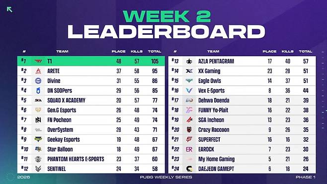 오늘 일정을 통해 위클리 스테이지 2주 차 통합 순위도 결정됐다. 15매치 성적을 모두 합산한 결과, T1이 총점 105점으로 1위에 올랐다. 특히, 이들은 24개 팀 중 유일하게 100점대 점수를 기록해 '위클리 파이널’에서의 활약에 대한 기대감을 높였다.