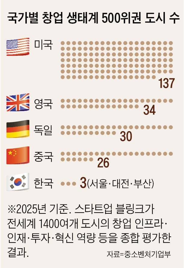 이는 서울을 제외하면 세계 100위권에 속하는 국내 창업 도시가 한 곳도 없는 현실과 맞닿아 있다. 글로벌 창업 생태계 평가 기관인 스타트업 블링크가 선정한 세계 창업 생태계 500위권 중 국내 도시는 2025년 기준 서울(20위)과 대전(366위)·부산(393위) 단 세 곳뿐이었다. 미국 137곳, 영국 34곳, 중국 26곳인 것과 비교하면 격차가 크다. 지난해 기준 국내 벤처캐피털(VC) 10곳 중 9곳이 수도권에 몰려 있고, 지방대 졸업생이 지역에 정착하는 비율(35.7%)도 수도권(87.5%)의 절반에 못 미친다. 국가 단위 스타트업 생태계는 세계 20위로 우수하지만, 지역 창업 생태계는 열악한 실정이다.