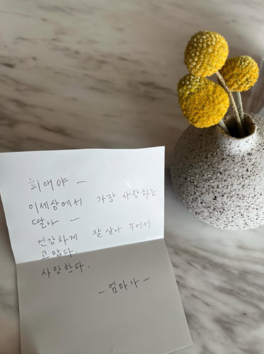 손편지 안에는 "희애야 이 세상에서 가장 사랑하는 딸아, 건강하게 잘 살아 주어서 고맙다. 사랑한다. -엄마가-"라고 적혀 있어 보는 이들까지 감동하게 만들었다.