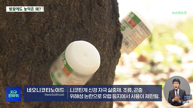 도시 벚나무에는 나무 주사, 즉 수간주사 방식으로 살충제가 주입됩니다. 최 박사는 “2024년 MBC 뉴스데스크 ‘지구한바퀴’ 취재에 응했을 당시 서울 안양천 수백 그루 벚나무 밑동마다 주사액이 꽂혀 있었고, 약 성분은 디노테퓨란이었다”고 말했습니다. 디노테퓨란은 유럽에서 꿀벌 위해성 때문에 실외 사용이 전면 금지된 네오니코티노이드 계열 살충제입니다. 이렇게 나무 주사로 주입된 약이 하루도 지나지 않아 나무 전체로 퍼지고, 꽃과 꽃가루, 꿀에도 그대로 들어간다는 게 최 박사의 설명입니다.