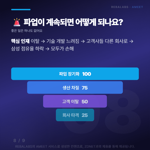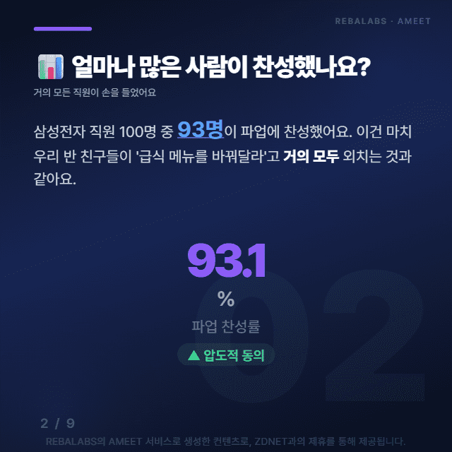 최근 삼성전자에서 93%라는 압도적인 찬성률로 파업이 결정됐어요. 100명 중 93명이 손을 든 거니까, 정말 거의 모든 직원이 목소리를 낸 거죠.