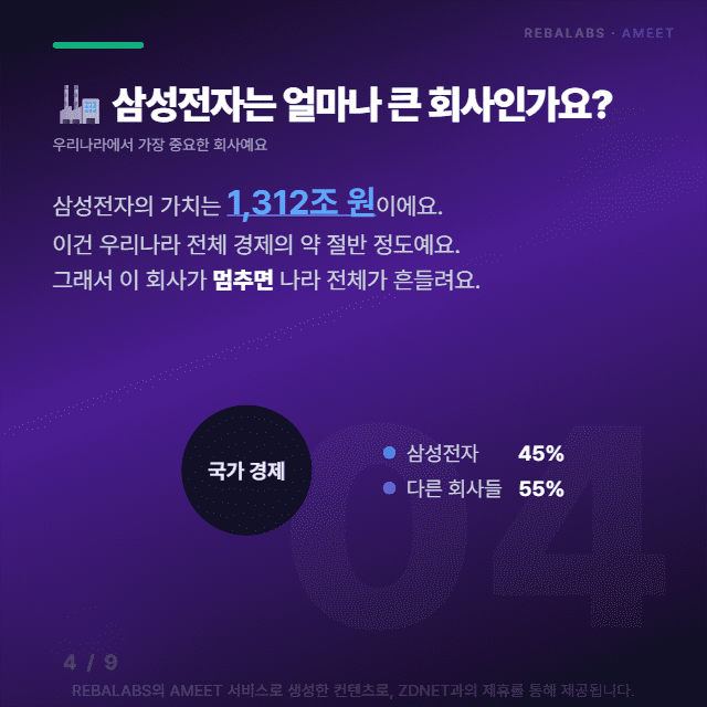 삼성전자는 우리나라에서 정말 중요한 회사예요. 회사 가치만 1,312조 원으로 우리나라 전체 경제의 거의 절반을 차지하고 있거든요. 그만큼 이 회사가 흔들리면 나라 전체가 영향을 받을 수밖에 없어요.