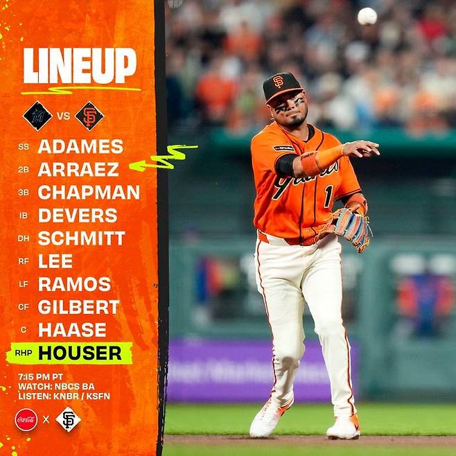 이날 샌프란시스코는 윌리 아다메스(유격수)~루이스 아라에스(2루수)~맷 채프먼(3루수)~라파엘 데버스(1루수)~케이시 슈미트(지명타자)~이정후(우익수)~엘리엇 라모스(좌익수)~드류 길버트(중견수)~에릭 하스(포수) 순으로 타순을 구성했다.