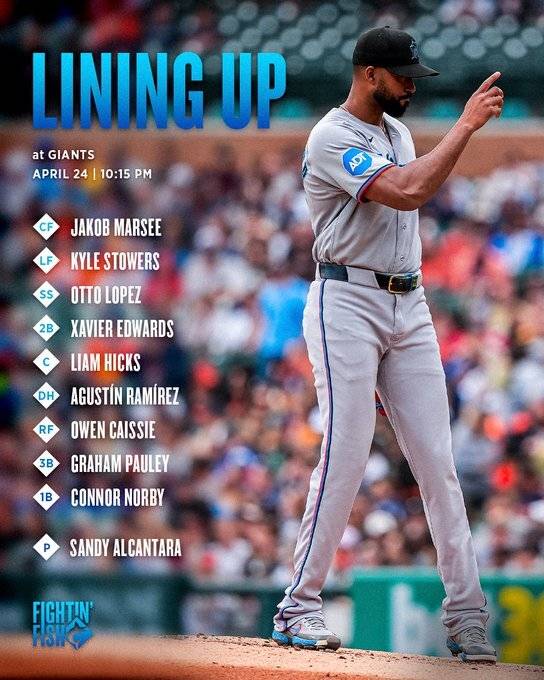 마이애미는 제이콥 마시(중견수)~카일 스타워스(좌익수)~오토 로페스(유격수)~재비어 에드워즈(2루수)~리암 힉스(포수)~아구스틴 라미레스(지명타자)~오웬 케이시(우익수)~그레이엄 폴리(3루수)~코너 노비(1루수)가 나선다. 선발 투수로는 우완 샌디 알칸타라가 등판한다.