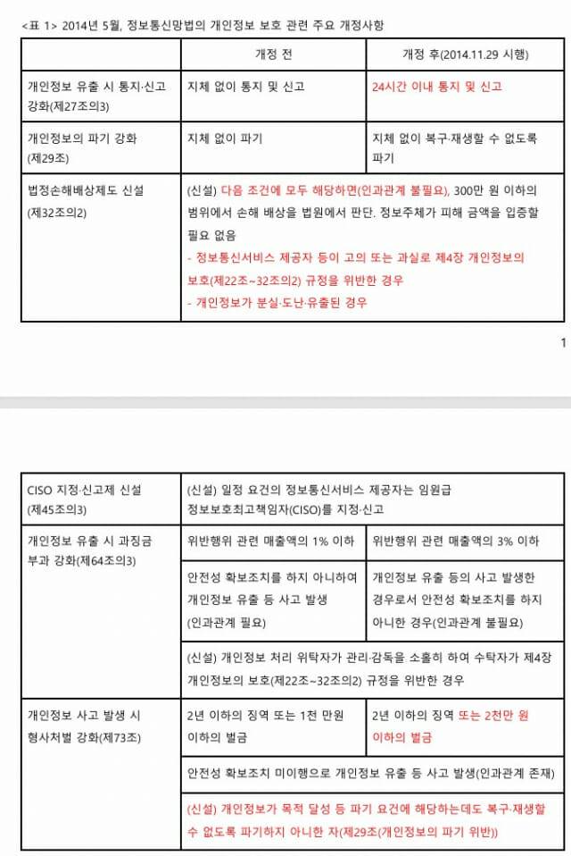 (개인정보보호법은 2014년 3월 개정 때 주민등록번호의 암호화, 다음 해 5월에 개인정보 보호 인증, 징벌적 손해배상제 및 법정손해배상제 등 ‘개인정보보호 정상화 대책’(안전행정부, 2014.7.)의 주요 내용을 포함하여 개정되었고, 사고 당시 ‘솜방망이’ 제재 규정으로 비판받았던 신용정보법 역시 2015년 3월에야 비로소 개인신용정보의 보호와 유출 시 과징금 부과 등 ‘금융분야 개인정보 유출 재발방지 종합대책’(관계부처 합동, 2014.3.)의 주요 내용이 반영되어 대폭 개정되었다.)
