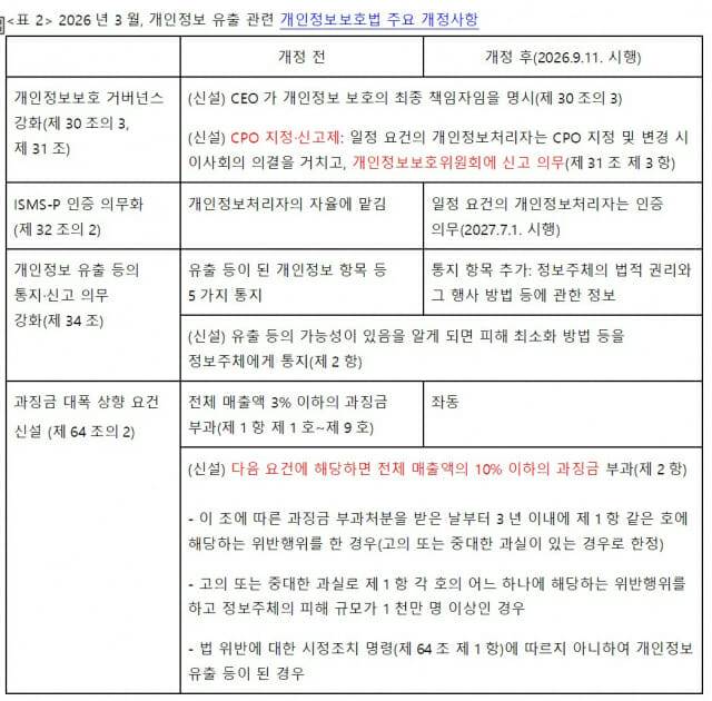 이와 관련해 올해 3월에 개정된 개인정보보호법의 주요 내용은 다음과 같다.