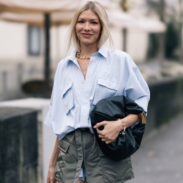 블루 셔츠와 데님 조합은 한 끗 포인트가 스타일의 인상을 좌우합니다. 비슷한 톤의 아이템을 매치할수록 핏과 소재에서 오는 미묘한 차이가 전체 인상을 결정하는 것인데요. 강민경은 넉넉한 피트감의 데님 바지와 하늘하늘한 소재의 블루 셔츠를 스타일링해 차분하면서도 우아한 실루엣을 연출했어요. 이때 같은 톤의 상하의를 어색하지 않게 만드는 액세서리는 바로 벨트. 꾸민 듯 꾸미지 않은, 결혼식 하객룩으로도 잘 어울려 보이네요.