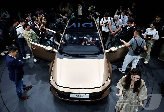 (베이징 로이터=뉴스1) 장용석 기자 = 24일 중국 베이징에서 열린 베이징 국제자동차전시회 '오토 차이나' 현대차 부스에서 관람객들이 현대차 아이오닉 브랜드의 신형 전기차 '아이오닉V' 주변에 모여 있다. 2026.4.24.