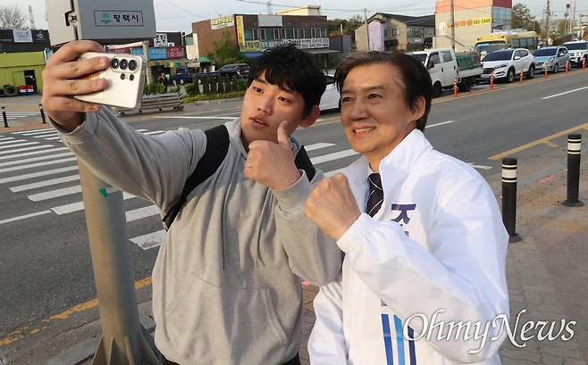 | ▲ 평택을 재선거에 출마한 조국 조국혁신당 후보가 23일 오후 경기도 평택 안중오거리에서 퇴근길 인사를 하던 중 한 학생의 기념사진 요청에 응하며 포즈를 취하고 있다. |