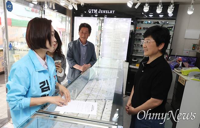 | ▲ 평택을 재선거에 출마한 김재연 진보당 후보가 23일 오후 경기도 평택 팽성시장을 찾아 상인들의 고충을 듣고 있다. |
