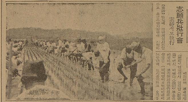 | ▲ 친일파 김홍식 부천군수의 1943년 6월 17일 매일신보 기사 이 사진은 일제강점기 1943년 6월 14일 제16회 권농기념일을 맞이하여 부천군수 김홍식이 참여한 가운데 소사신찬답(소사읍 구지리)에서 진행된 풍년기원제 모습이다. 구지리는 현재의 송내동이다. |