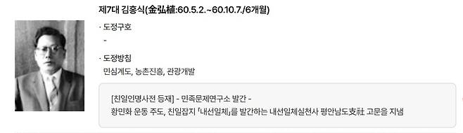 | ▲ 김홍식의 친일행적을 알려주는 충청남도 누리집 제10대 부천군수(1943년3월~1945년8월)를 지냈던 김홍식은 1960년 5월 제7대 충청남도 도지사가 되었다. 충청남도에서는 역대도지사를 설명하며 김홍식을 친일파로 표시하여 안내하고 있다. 이러한 사례는 전국적으로 친일잔재를 청산하는 모범적인 사례라할 수 있다. |