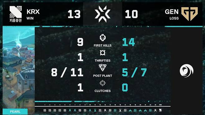 잠시 정비 이후 두 번째 맵 펄에 입장한 2팀. 이번 경기에는 앞선 경기와 달리 키움 DRX의 초반 흐름이 더 좋았다. 8라운드 기준 6대2로 점수를 더 많이 가져간 것.