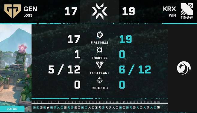 결국 경기를 가져간 팀은 키움 DRX. 이들은 접전 끝에 17대19로 세 번째 맵 경기를 가져갔다. 그리고 이 경기를 통해 키움 DRX는 맵 스코어 2대1 승리를 확정하고, 4승 0패로 그룹 스테이지 전승을 이어갔다.