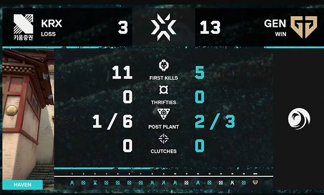 세팅을 마친 이후 첫 번째 맵 헤이븐에 입장한 2팀. 초반 흐름은 젠지가 좋았다. 6라운드 기준 6대0으로 점수를 일방적으로 가져간 것. 이들은 이후에도 점수를 가져가 7라운드 만에 전반전 리드를 확정했다.