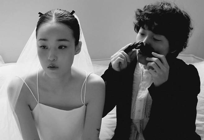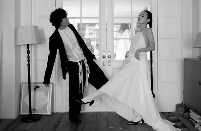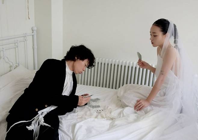 이날 오존과 전주니의 웨딩화보가 공개된 가운데 사진 속 이들은 티셔츠에 면사포를 쓰고 침대 위에서 카드놀이를 하고 있는 등의 모습으로 자유로운 무드와 케미를 뽐냈다.
