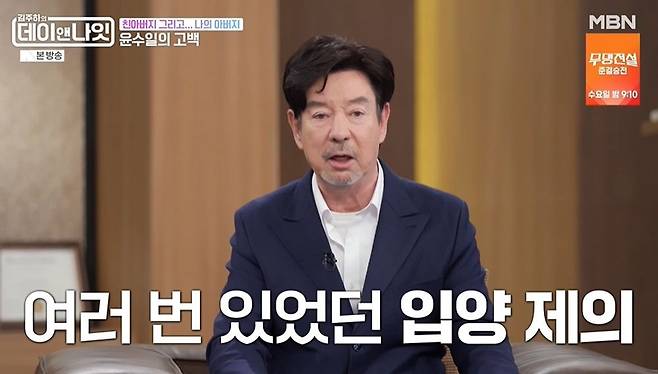 윤수일은 "초등학교에 보내야 하니 이름, 호적이 있어야 하지 않냐"라며 "그때 대한민국의 전쟁 후 혼혈인들을 입양 보내던 분위기였다. 근데 어머니 고집으로 절 혼자 키우신 거다"라며 미국으로 입양 갈 뻔했다고 털어놓았다.