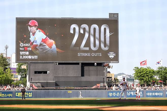 양현종은 경기 초반 의미 있는 기록을 달성했다. 이날 경기 전까지 탈삼진 2199개를 기록한 양현종은 1회초 선두타자 한태양에게 삼진을 솎아냈다. KBO리그 역사상 처음으로 2200탈삼진 고지를 밟는 순간이었다. 이어 빅터 레이예스, 전준우에게도 삼진을 잡아내며 깔끔하게 이닝을 끝냈다.