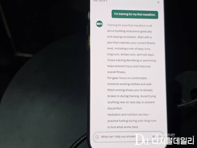 스마트폰 화면 속 ‘애스크 딕스(Ask DICK’S)’ 챗봇이 방문자에게 질문을 던지며 대화를 이끌었다. 사용자가 “달리기를 좋아하는데 이번에 첫 마라톤을 준비하고 있어”라고 입력하자 AI는 훈련 계획, 장비, 영양 관리까지 맥락에 맞는 조언을 해줬다. 사용자의 러닝 수준, 실내외 여부, 노면 환경을 하나씩 좁혀가던 AI 챗봇은 마지막쯤 쿠션과 지지력을 강조한 러닝화 몇 가지를 추천했다.