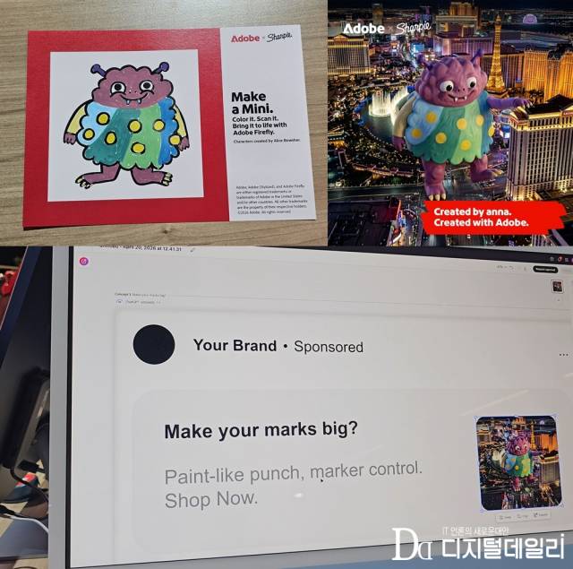 테이블 위에는 영국 일러스트레이터 앨리스 바우셔(Alice Bowsher)가 디자인한 귀여운 몬스터 캐릭터 스케치가 놓여 있었다. 샤피 매직펜으로 캐릭터를 직접 색칠한 뒤 스캔하자 어도비 ‘파이어플라이 보드’가 이를 3D 이미지로 변환했다. 구글 제미나이 3.1을 활용해 생성된 이미지는 라스베이거스 야경을 배경으로 한 대형 캐릭터 합성 이미지로 탈바꿈했다. 직원은 “파이어플라이를 포함해 어떤 AI 모델이든 파이프라인에 연결할 수 있다”고 설명했다.