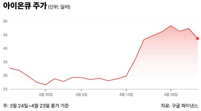 엔비디아와 아이온큐의 발표 이후 미국 양자컴퓨팅 기업 주가는 크게 상승했다. 4월 23일 종가 기준 아이온큐는 43.63달러(약 6만4650원)에 거래돼 4월 13일 대비 46.6% 올랐다(그래프 참조). 같은 기간 미국 양자컴퓨팅 기업 디웨이브퀀텀, 퀀텀컴퓨팅, 리게티컴퓨팅 주가도 각각 31.8%, 24.5%, 11.4% 상승했다.