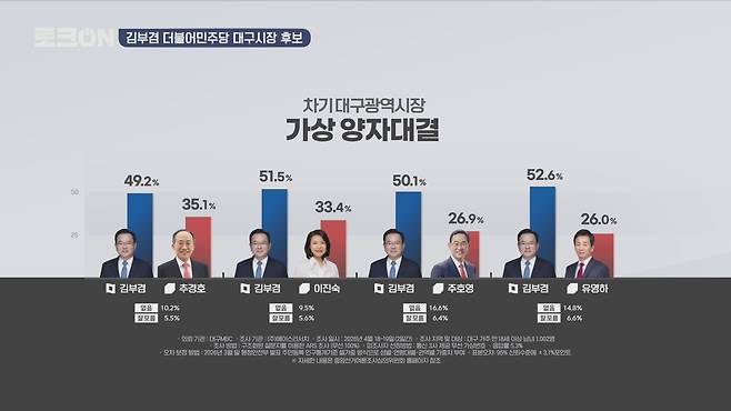 김 후보와 국민의힘 본경선에 오른 유영하, 추경호 의원, 그리고 무소속 출마 가능성이 있는 이진숙 전 방송통신위원장, 불출마를 밝히기는 했지만, 저희 조사 시점에는 출마 가능성이 있었던 주호영 의원까지 4명과의 1대 1 가상대결에서 모두 김 후보가 오차 범위 밖에서 우세한 것으로 나타났고요.