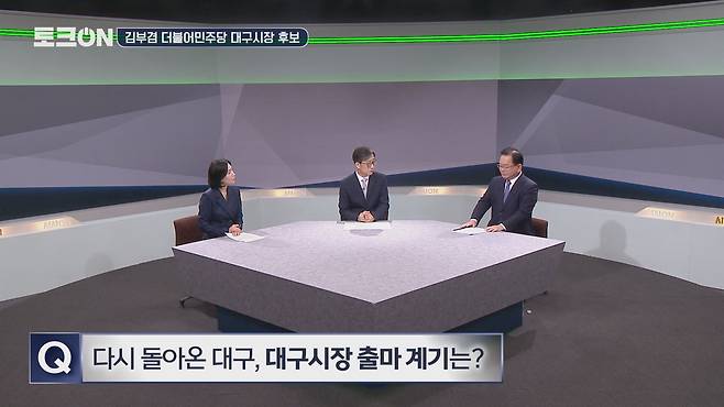 보도국 김은혜 기자가 함께 후보자를 만납니다. 오늘 첫 번째 순서로 김부겸 더불어민주당 대구시장 후보 모셨습니다. 어서 오십시오. 국무총리 임기 끝나고 정계를 떠나지만, 지난 대선 당시에 선대위원장으로 대구 곳곳을 누비시던 기억이 선명하게 다시 나는군요. 정치인으로서 은퇴하고 잊혀지고 싶었겠지만, 결국 다시 돌아오셨습니다. 대구시장 선거에 출마를 결심하게 된 결정적 계기 무엇이라고 할 수 있을까요?