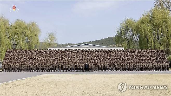 (서울=연합뉴스) 김정은 북한 국무위원장이 지난 25일 조선인민혁명군(빨치산) 창건 94주년을 맞아 인민군 서부지구 기계화보병사단관하 연합부대를 축하방문해 장병들을 격려했다고 조선중앙TV가 26일 보도했다. 김 위원장은 여단 전체 장병들과 기념사진을 찍고, 부대 군인들과 함께 체육 경기도 관람했다. [조선중앙TV 화면] 2026.4.26