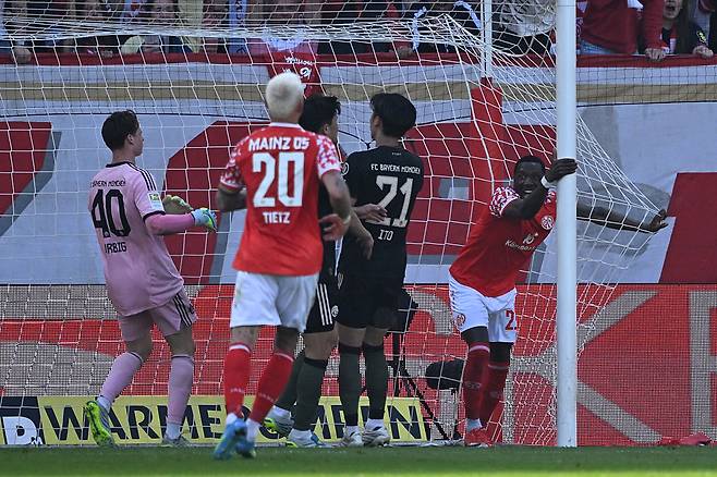 뮌헨은 이른 시간 실점을 허용하며 흔들렸다. 전반 15분 코너킥 이후 혼전 상황에서 사노 카이슈가 문전으로 투입한 볼을 도미니크 코어가 오른발 발리 슛으로 마무리하며 마인츠가 앞서 나갔다. 전반 29분에는 나딤 아미리가 박스 안에서 시도한 오른발 슛이 요나스 우르비히의 선방에 막혔으나 튕겨 나온 볼을 파울 네벨이 오른발로 밀어 넣으며 추가골을 터뜨렸다.