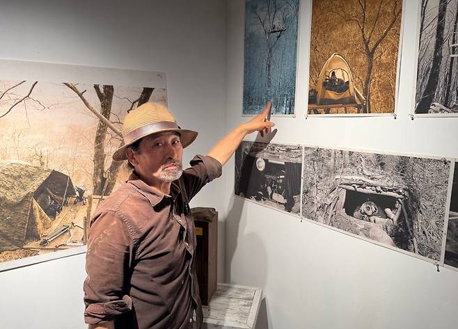 | ▲ 최기순 감독과 호랑이 촬영천막 여러 차례 야생호랑이 촬영을 하면서 사용했던 천막들을 보여주고 있다. |