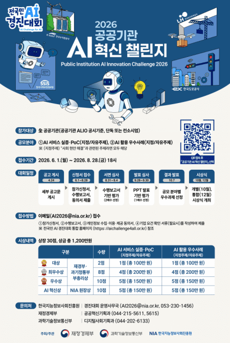 (지디넷코리아=박수형 기자)과학기술정보통신부와 재정경제부가 주최하고 한국지능정보사회진흥원이 주관하는 ‘2026 공공기관 AI 혁신 챌린지’가 24일 공고됐다.