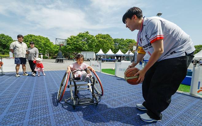 26일 서울 송파구 올림픽공원에서 열린 2026년 스포츠 주간 맞이 '땀송송 운동해봄제'에서 시민들이 '킹키와 함께 뛰는 응원봉런', 휠체어 농구 등을 체험하고 있다.