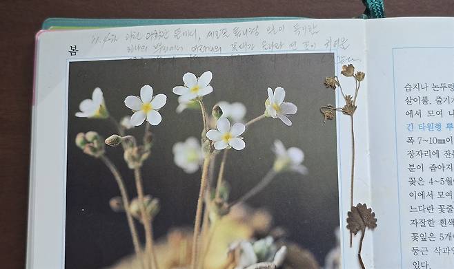 '봄맞이'를 처음 만난 날의 기록이다. 봄맞이는 이름 그대로 봄을 마중 나가기 좋은 시기에 이르지도 늦지도 않게 꽃이 핀다. 당시 나는 이 작은 풀꽃에 매료되었던 모양이다. 마지막 문장으로 '사랑하게 될 것 같다'는 예언 같은 말을 남겼으니 말이다. 그 글귀는 여백이 부족해 꽃이 인쇄된 부분에 적혀 있었다. 눈에 잘 띄지 않아 마치 오랜 시간 비밀을 간직한 봉인된 주문처럼 느껴졌다.