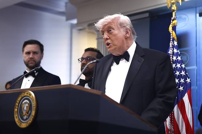 | ▲ 2026년 4월 25일, 워싱턴 D.C.에서 백악관 출입기자 만찬이 열리고 있던 워싱턴 힐튼호텔 연회장 밖에서 총격 사건이 발생한 후, 도널드 트럼프 미국 대통령이 백악관 브리핑실에서 발언하고 있다. |