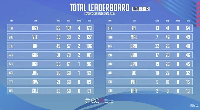 한국은 앞선 1일 차에 1치킨 포함 46점을 누적하며 베트남에 이어 2위에 이름을 올렸다. 이튿날 55점을 얻으며 분전했지만 베트남을 따라잡진 못했다. 16개 팀 중에선 4위다.