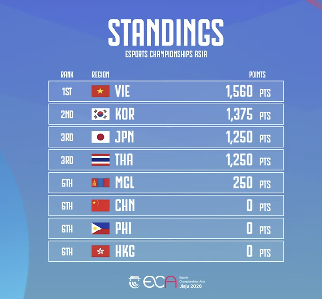 ECA 대회는 지금까지 대전격투, e풋볼 시리즈, 스테핀(개인전), 배틀그라운드 모바일까지 우승 팀을 가렸다. 현 시점에서 베트남이 ECA 종합 우승 포인트 1560점을 누적해 1위에 올랐다. 한국은 1375점으로 뒤를 쫓고 있다. 일본(1250점), 태국(1250점), 몽골(250점) 등이 뒤를 이었다. 남은 경기는 ‘이터널 리턴’과 스테핀(단체전)이다. 1000점이 걸린 이터널 리턴은 전날 한국이 독보적인 1위에 오른 종목이다.