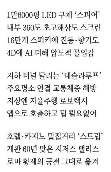 땅 아래도 바뀌었다. 일론 머스크 테슬라 최고경영자(CEO)가 이끄는 보링 컴퍼니가 만든 '베이거스 루프(Vegas Loop)'는 테슬라 차량으로 지하 터널을 달리는 이동 시스템이다. 컨벤션센터와 주요 리조트를 순식간에 잇는다. 지상 교통체증은 이제 잊어도 된다.
