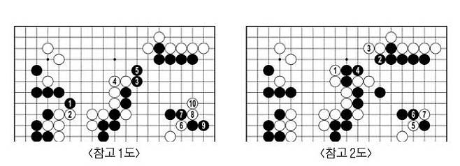 백2로 젖혔고 흑3에 끊었다. 이 뒤로 흑이 위쪽에서 살았고 백은 32로 뻗어 오른쪽 흑집을 뒤흔들려 한다. 오른쪽은 작은 불꽃이 튀어도 활활 타오를 곳이다. <참고 1도> 흑3·5로 지켜도 백6·8로 수를 내자고 하면 이 끝에 무엇이 나타날지 짐작조차 어렵다. 인공지능 카타고는 백8로는 <참고 2도> 1을 두라고 한다. 5·7이 더 파괴력이 크다는 얘기다.