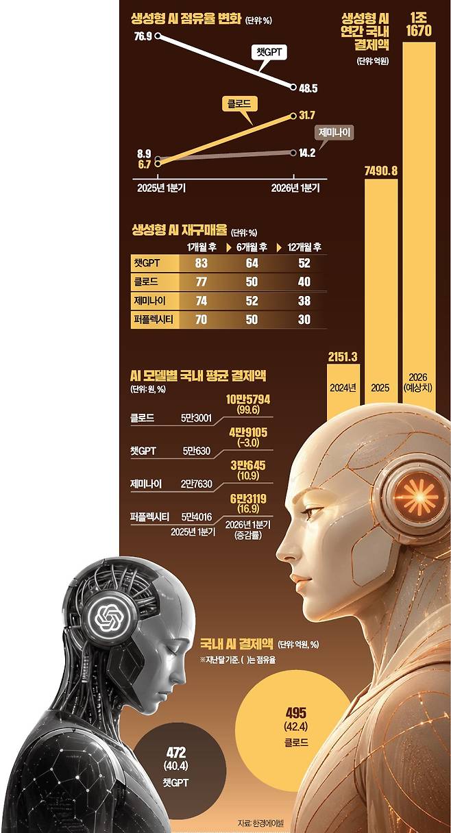 26일 한경에이셀(Aicel)에 따르면 지난달 클로드의 국내 신용카드 결제액은 495억원에 달했다. 줄곧 국내 1위를 지킨 챗GPT(472억원)를 처음으로 추월했다. 구글 제미나이의 지난달 결제액은 137억원이었다. 결제액 기준 시장 점유율은 클로드가 42.4%, 챗GPT가 40.4%였다.