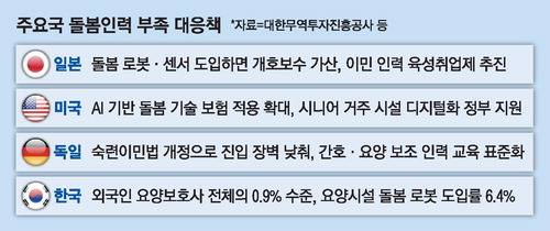 일본과 유럽 등 주요 선진국 대비 2~7배 빠른 고령화 속도에 대응하기 위해 인공지능(AI) 돌봄 기술 도입과 이민 노동자 활용 등 '공급망 다변화'에 속도를 내야 한다는 목소리가 높다.