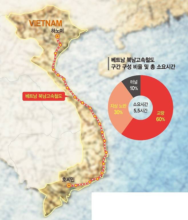 하노이와 호찌민을 잇는 1541㎞ 구간에 시속 350㎞급 철도를 구축하는 메가 인프라 사업이 연말 사업자 선정을 앞두고 치열한 외교전이 시작됐다. 가장 앞서 있다고 평가받는 한국뿐 아니라 중국, 일본, 프랑스가 각국의 국가원수까지 직접 나서면서 '철도 외교전'을 펼치는 가운데, 최근에는 스페인까지 가세하며 수주전은 한층 복잡한 5파전 양상으로 치닫고 있다.