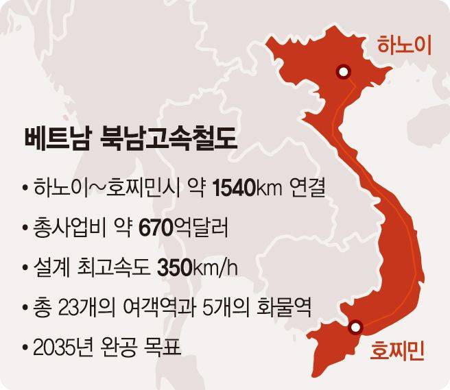 베트남 북남고속철 사업은 하노이와 호찌민시를 잇는 총연장 약 1540㎞ 규모의 고속철도 건설 프로젝트로, 사업비만 670억달러(약 98조9925억원)에 달하는 베트남 최대 인프라 사업이다.