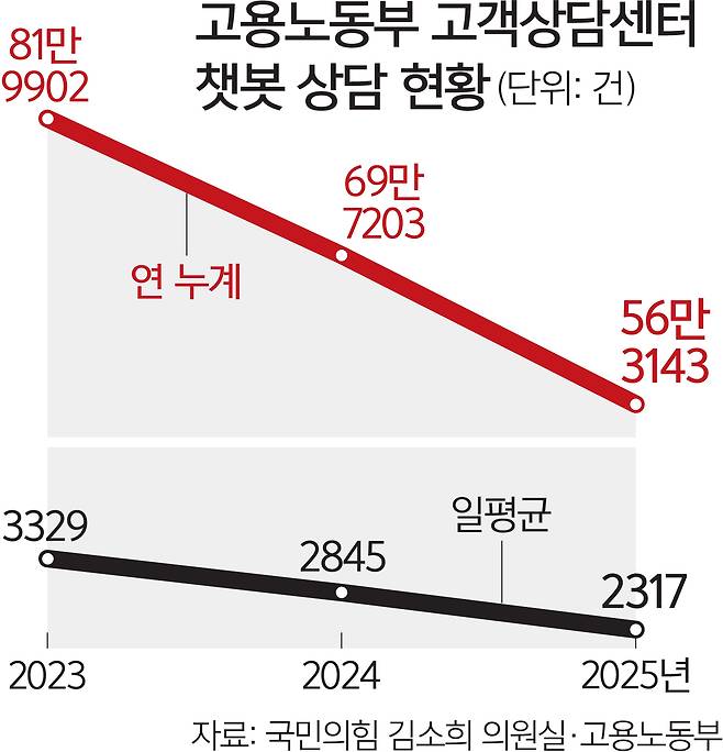 고용노동부가 국민의힘 김소희 의원실에 제출한 ‘챗봇 일평균 상담 현황’ 자료에 따르면 챗봇 시스템의 일평균 상담 건수는 도입 첫해인 2023년 3329건에서 2024년 2845건, 2025년 2317건으로 매해 감소했다. 연도별 누적 상담 건수도 2023년 81만9902건에서 2025년 56만3143건으로 31.3% 줄었다.