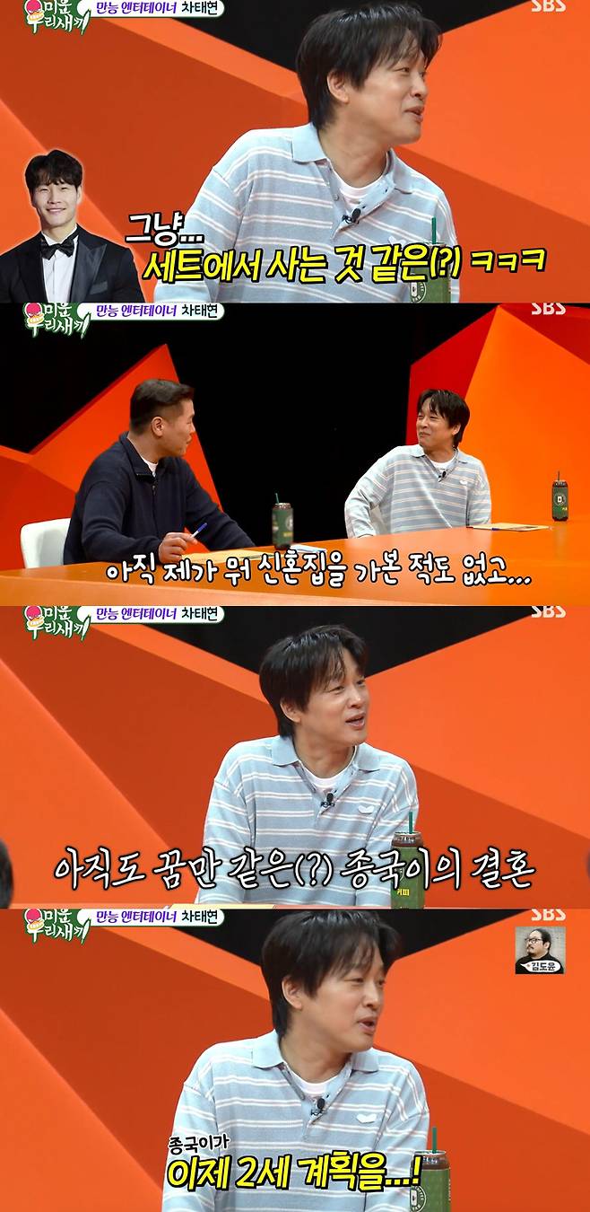 이날 차태현은 절친 김종국의 결혼 생활에 대해 "아직도 결혼한게 가짜같다. 일단 결혼식에서만 봤다. 그냥 세트에서 사는 것 같다. 아직 제가 신혼집을 가본 적도 없다. 그집을 가기 전까지는 믿을 수 없다"고 솔직하게 밝혔다.